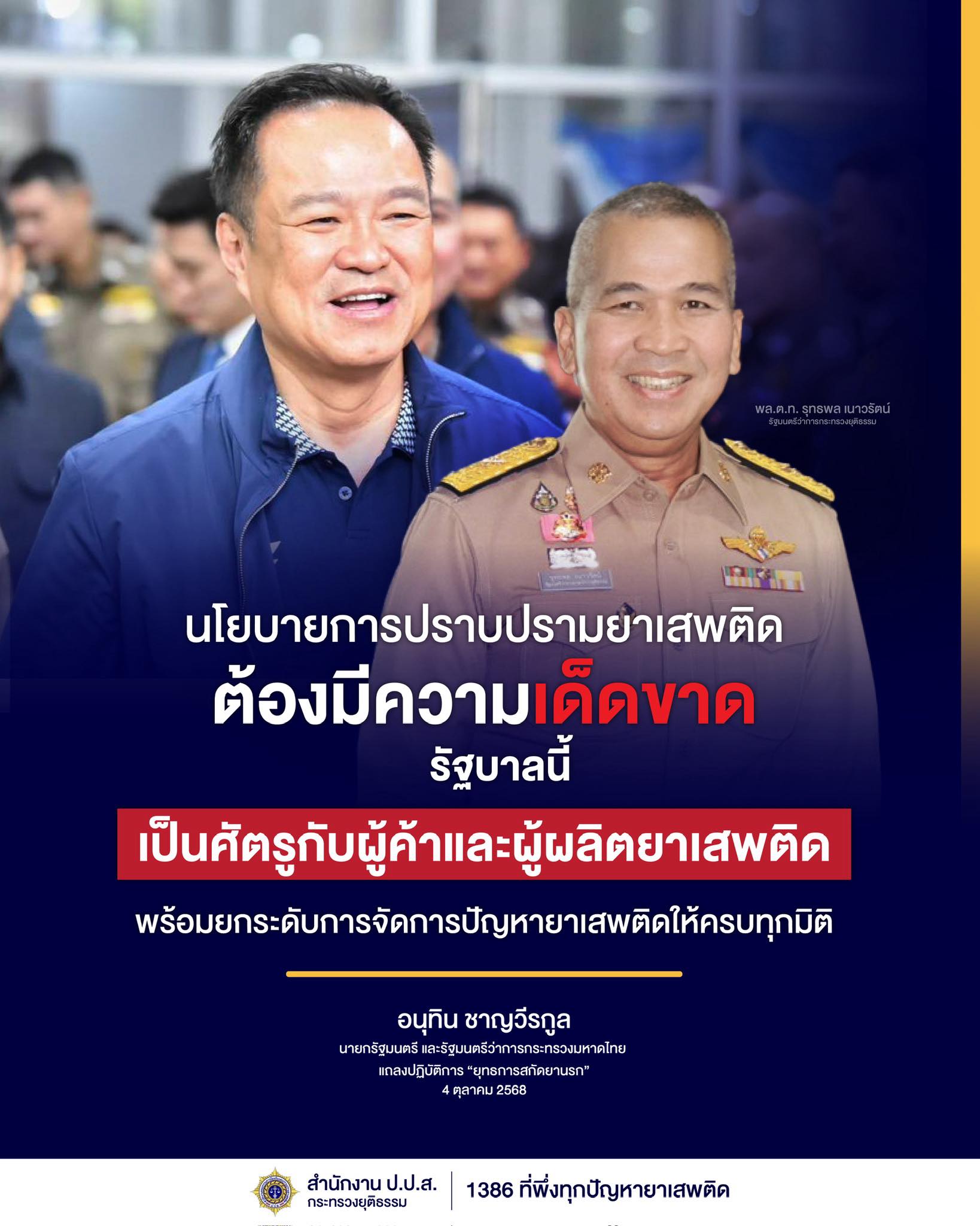 Mr. Anutin Charnvirakul, the new Prime Minister of Thailand, has implemented continuous policies to combat drug problems both domestically and internationally. The Thai government is stepping up its efforts to eradicate drug-related crimes, announcing a clear policy that declares itself “an enemy of drug dealers and producers.” This firm stance underscores the government’s determination to intensify law enforcement and tackle drug issues from every angle, aiming to build a safer and drug-free society.